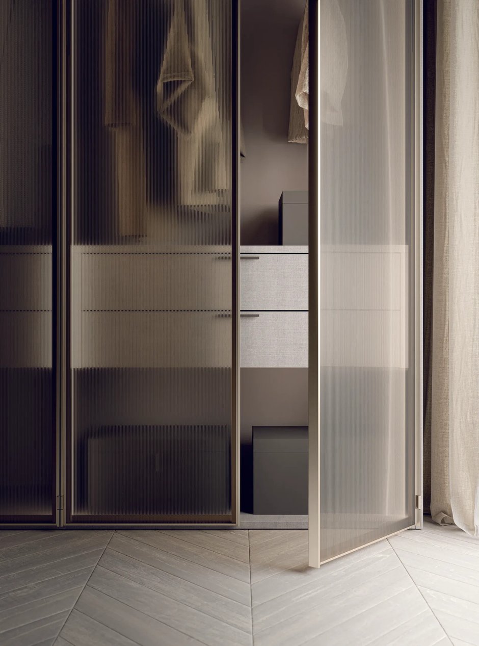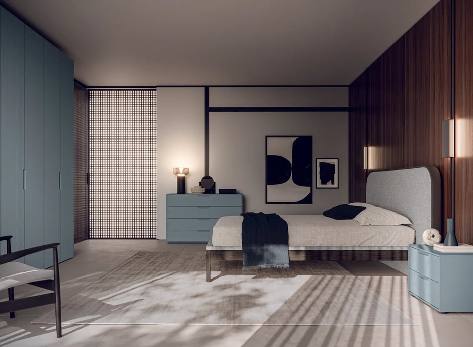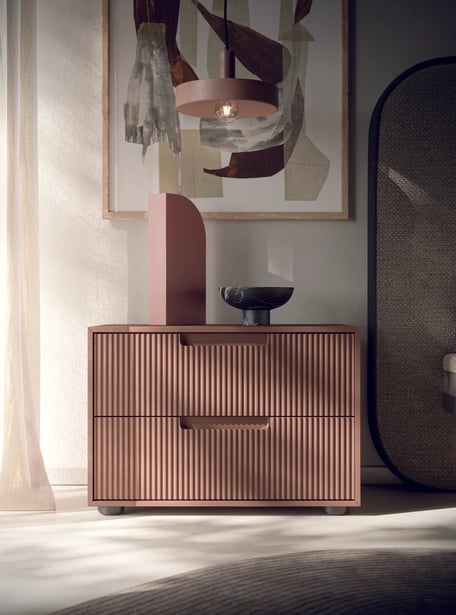 La finitura Grecato è presente sia nella zona giorno sia nella zona notte delle collezioni Homy, adattandosi con naturalezza a diversi volumi e tipologie di prodotto, come pensili e basi per il living, comò, comodini e settimanali, nonché ante battenti per gli armadi. Questa flessibilità rende Grecato ideale per creare ambienti coordinati, dove ogni elemento dialoga con l'altro attraverso un linguaggio materico coerente e contemporaneo.